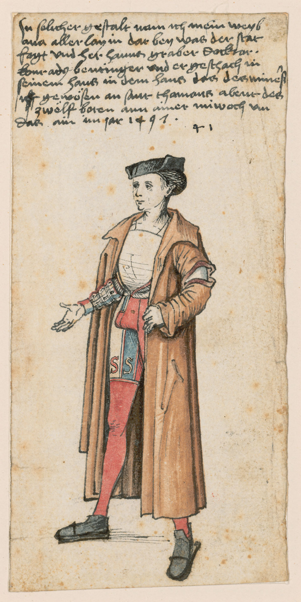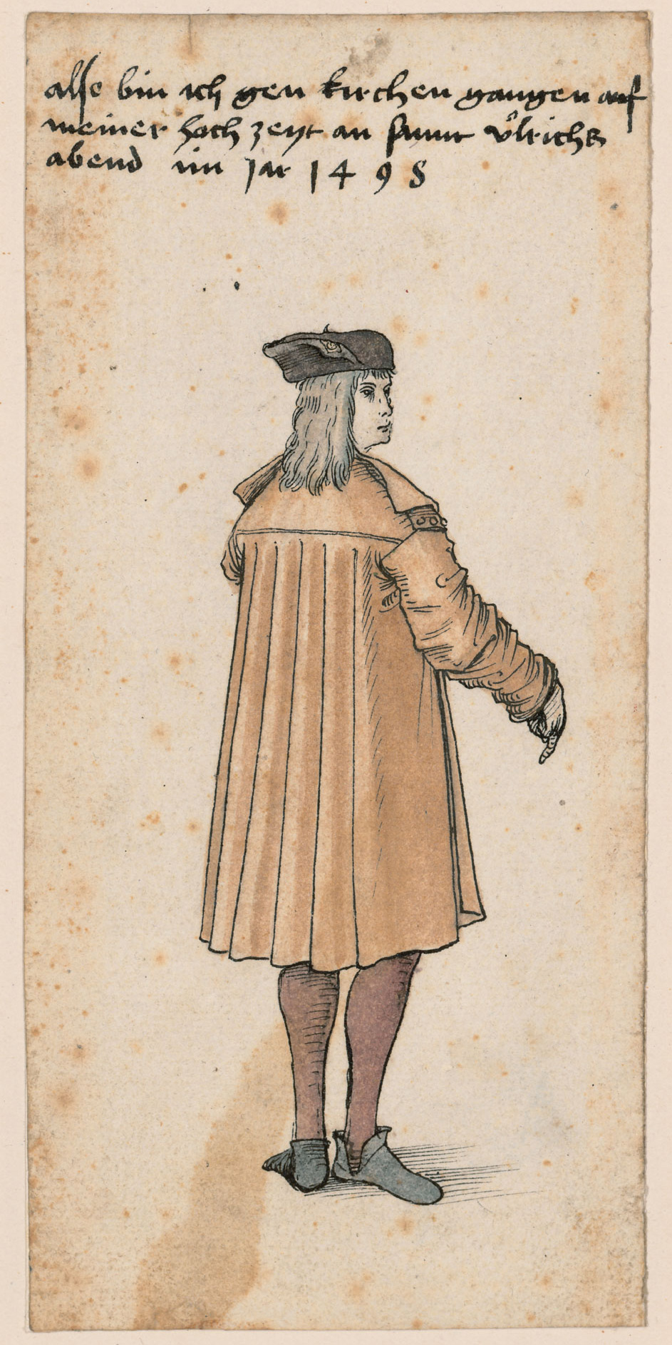 Hans, Burgkmair d.Ä., Selbstbildnis Hans Burgkmairs als Bräutigam, 1497, Feder in Grauschwarz bzw. Schwarz, farbig aquarelliert, auf Papier, 157 × 75 mm