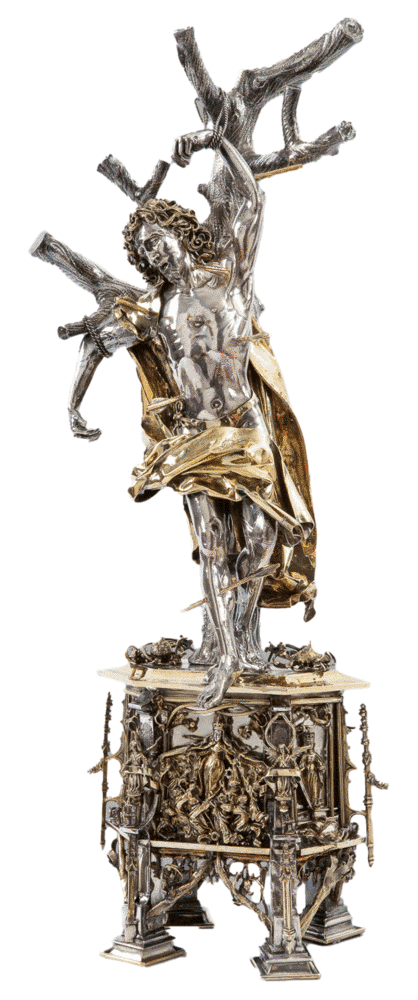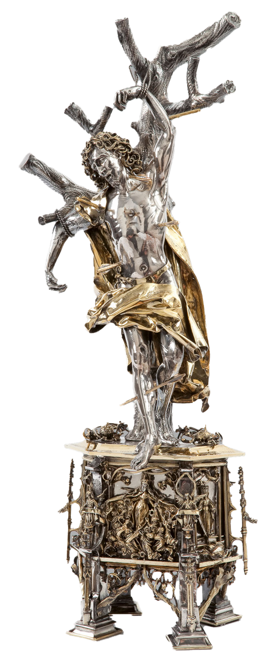 The statuette of St Sebastian is part of a reliquary. We do not know the name of the Augsburg goldsmith who made the silver statue, but Gregor Erhart made the sculpture that served as a model, for which Hans Holbein the Elder made the design drawing.