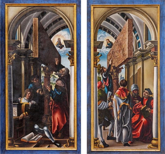 Photomontage of the view of the small organ with the shutters opened in their original arrangement (inner panels), see cats. 3.14, 3.15. Jörg Breu the Elder, Schola Cantorum (left) and Pythagoras at the Forge (right), c.1520